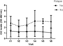 Los perros que experimentaron recaída tuvieron niveles significativamente más altos de CIC en comparación con los perros que no experimentaron recaída (p < 0,0001) (Figura 13); estos se elevaron de manera constante en todas las visitas (DO > 2) (Figura 13).