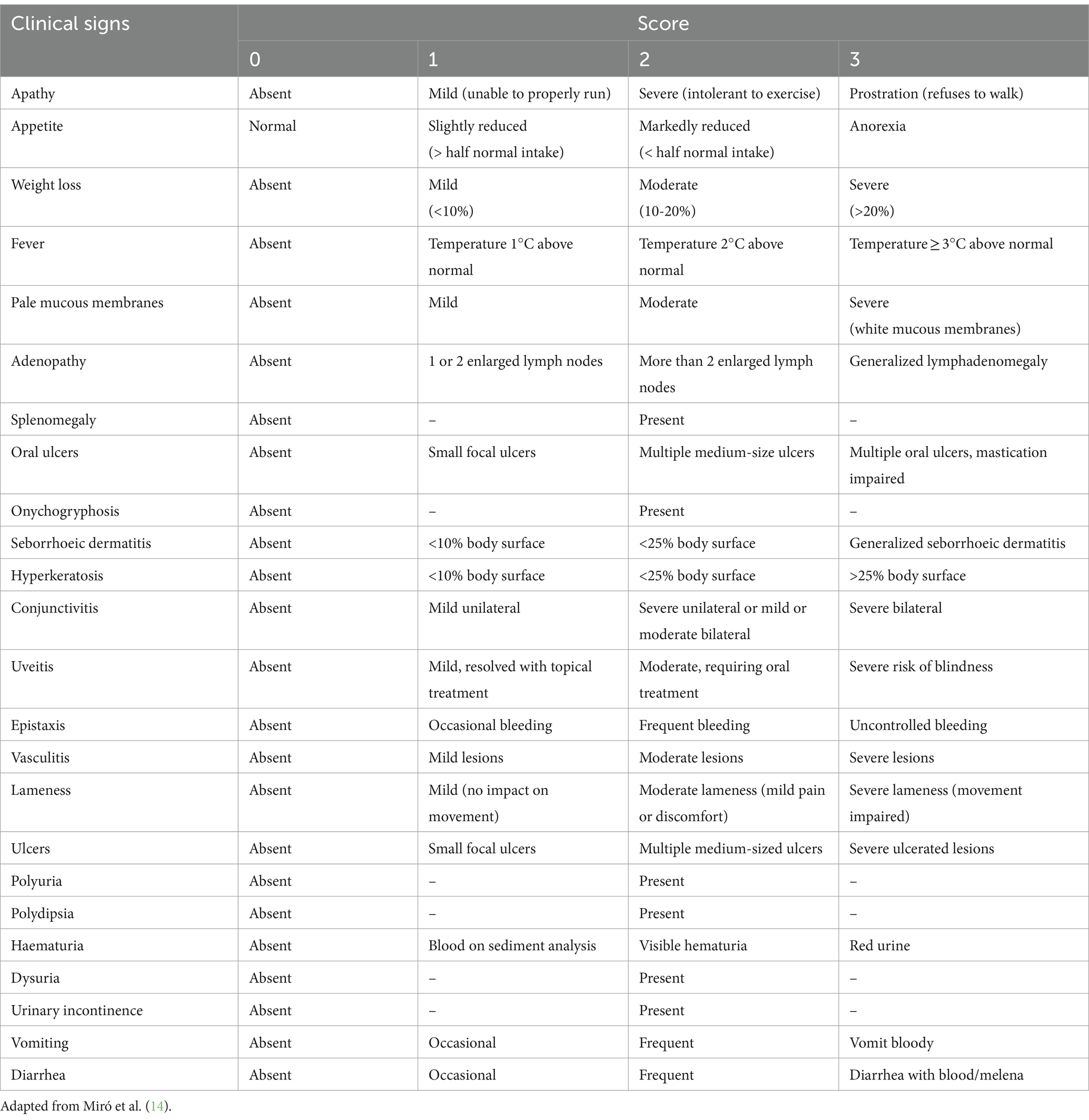 Los perros se sometieron a un examen físico exhaustivo en cada visita. Se recopilaron datos sobre signos clínicos, incluidos signos de depósito de CIC (Figura 2). Cada signo clínico se clasificó de 0 a 3 (gravedad baja a alta) para obtener una puntuación clínica global para cada animal (máximo 68) (Tabla 1).