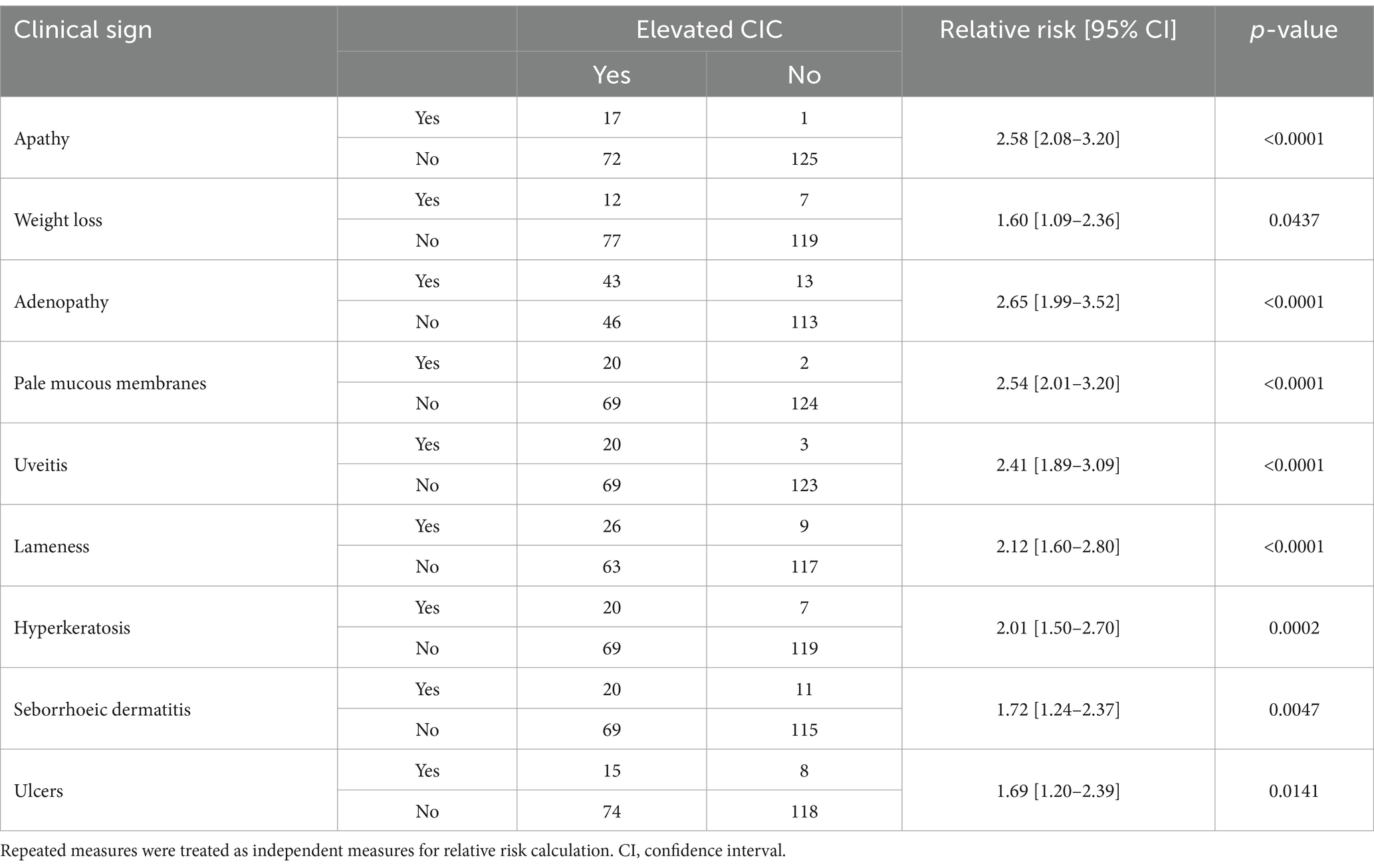 La puntuación clínica media otorgada a los 34 perros que completaron los 12 meses de seguimiento disminuyó gradualmente a lo largo del estudio (Figura 3), y las puntuaciones clínicas y los niveles de CIC mostraron una correlación positiva (Figura 3) (r = 0,5135, p < 0,0001). También se encontró que los perros que mostraban signos clínicos tenían un mayor riesgo de tener niveles elevados de CIC. En la Tabla 2 se muestran los riesgos relativos (RR) para diversos signos clínicos evaluados en asociación con la presencia de CIC en perros. Curiosamente, 10/44 perros (22,72%) tenían una puntuación clínica de cinco o menos, pero niveles altos de CIC (≥2 OD).