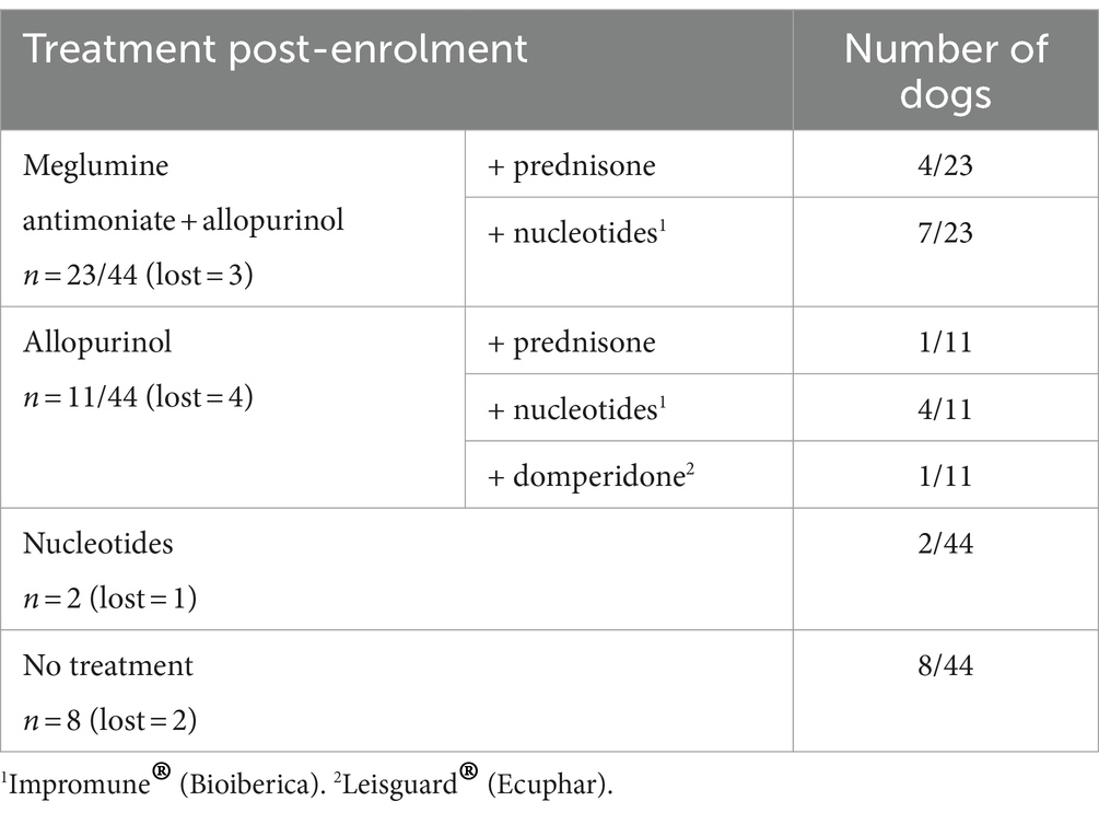 Dado que la CanL es una enfermedad crónica, en el momento de la inclusión algunos perros ya estaban recibiendo tratamiento con alopurinol (n = 15/44), domperidona (n = 1/44) (22-24), nucleótidos (n = 5/44) (25-28), prednisona (n = 1/44) o el inhibidor de la enzima convertidora de angiotensina benazepril (n = 2/44). Los regímenes de tratamiento de los perros después de la inscripción en este estudio se detallan en la Tabla 3.