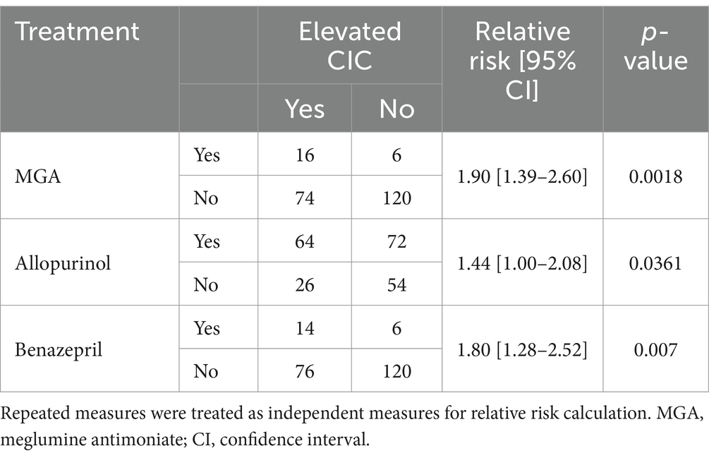 Los niveles de CIC fueron significativamente mayores en los perros tratados con antimoniato de meglumina (p = 0,0036) o alopurinol (p = 0,015) y en aquellos con proteinuria tratados con benazepril (p = 0,0039). Los perros tratados con antimoniato de meglumina o alopurinol o que recibieron benazepril para controlar la proteinuria tenían casi dos veces más probabilidades de tener niveles altos de CIC (Tabla 4). Por el contrario, no se detectaron diferencias según el tratamiento con nucleótidos (p = 0,0519) o prednisona (p = 0,2312).