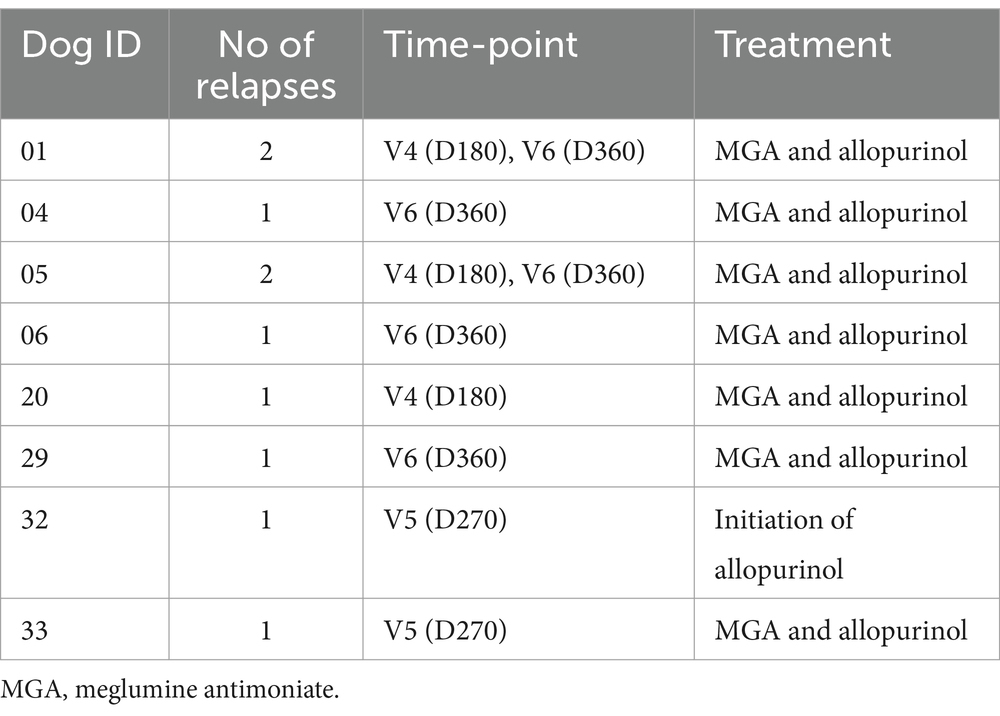 Se detectaron recaídas en el 23,18% de los animales. En el momento de la inclusión, 18 de los 44 perros habían tenido un diagnóstico previo de CanL y fueron remitidos para tratamiento debido a una recaída clínica. Durante el período de seguimiento de 12 meses, seis perros tuvieron una recaída y dos tuvieron dos recaídas (Tabla 5).