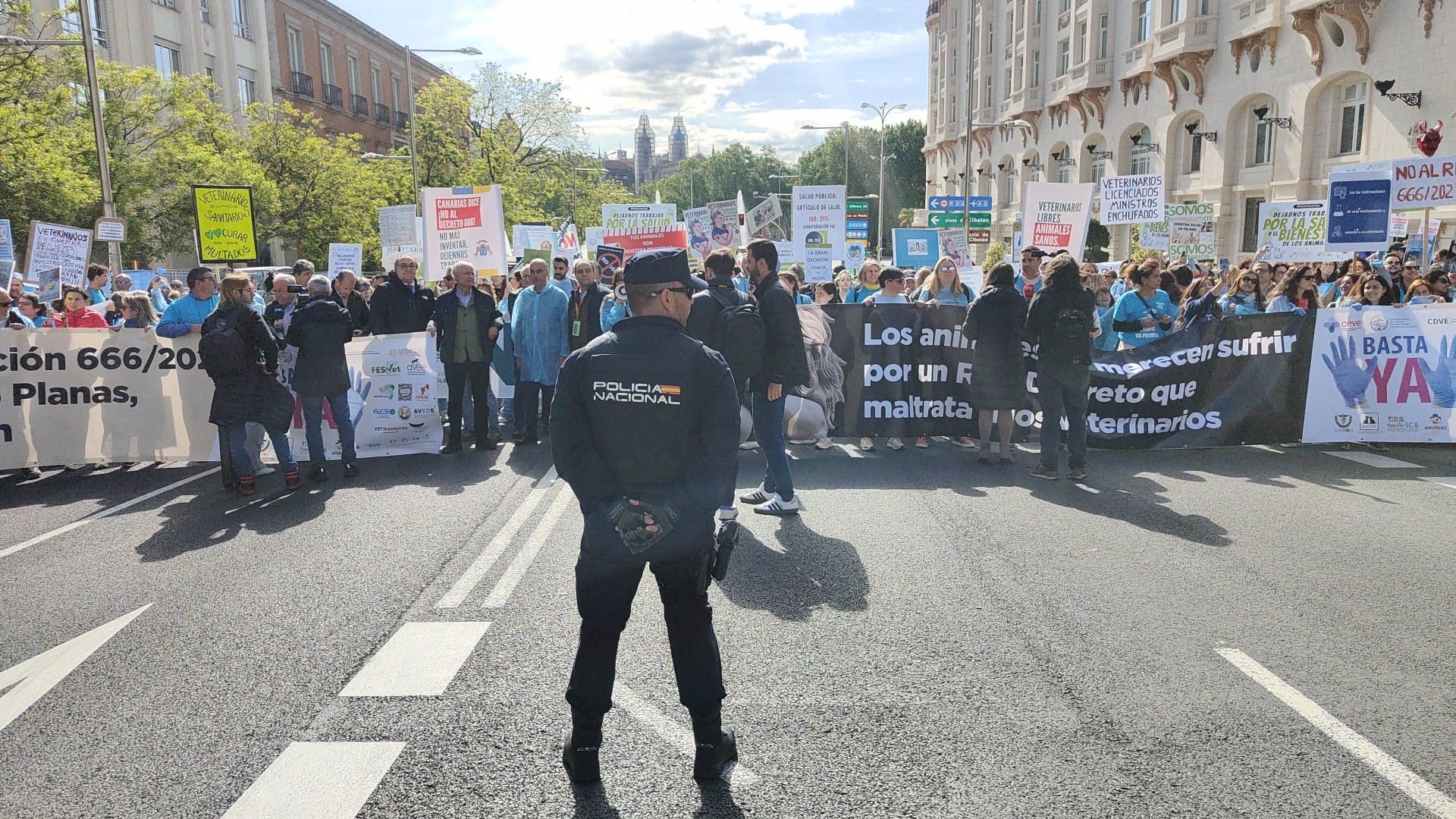 Con gritos como ‘Los veterinarios somos sanitarios’ y ‘Planas, escucha, estamos en la lucha’ y pancartas pidiendo la dimisión de Planas y protestando contra el Real Decreto (‘Los animales no merecen sufrir por un Real Decreto que maltrata a los veterinarios’), los participantes han cortado uno de los accesos a la Plaza de las Cortes.